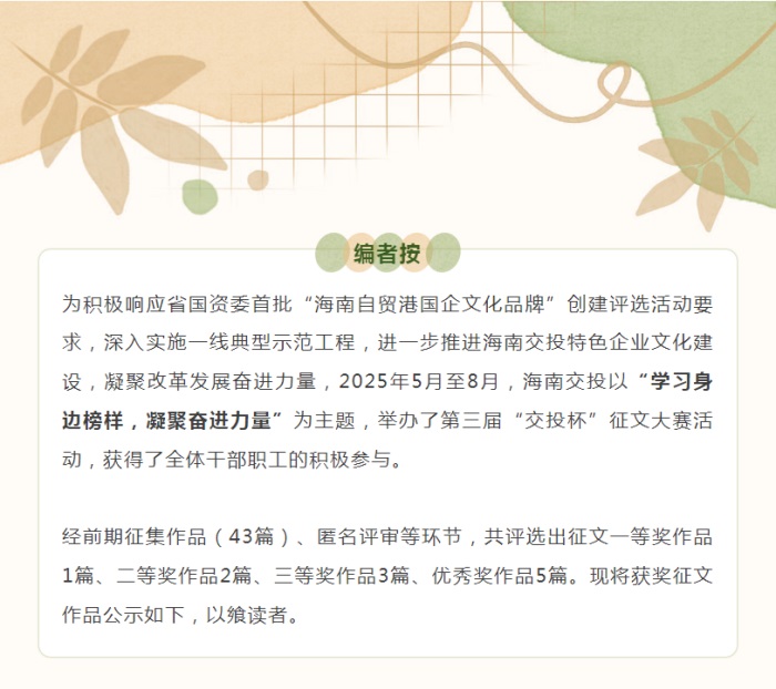 為積極響應省國資委首批“海南自貿港國企文化品牌”創建評選活動要求,深入實施一線典型示范工程,進一步推進海南交投特色企業文化建設,凝聚改革發展奮進力量,2025年5月至8月,海南交投以“學習身邊榜樣,凝聚奮進力量”為主題,舉辦了第三屆“交投杯”征文大賽活動,獲得了全體干部職工的積極參與。 [更多]