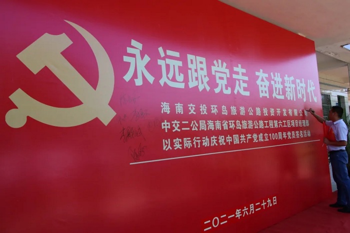 第二階段,全體黨員赴中交二公局環島旅游路六工區臨高分部繼續進行“慶建黨百年”簽名墻簽名儀式,共同合唱《沒有共產黨就沒有新中國》。