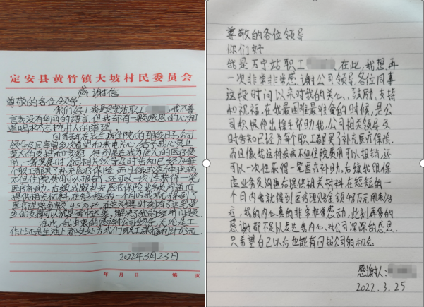 2022年初,兩封特殊的感謝信被遞交到海南交控工作人員手中。基層管理站兩名職工不幸確診癌癥,面對龐大的醫療費用一籌莫展之際,公司領導和同事多次看望,鼓勵其戰勝疾病,由于公司為職工購買了補充醫療保險,在相關工作人員的積極協助辦理下,兩位職工均在較短時間內獲得了45萬元的保險理賠金和3萬余元的醫療費用報銷,真正解決了他們的燃眉之急、后顧之憂,增強了他們戰勝病魔,早日康復回歸團隊并肩作戰的信心和決心。他們在感謝信中說:“由衷的感謝公司,無論是工作上還是生活上都處處為職工謀福利計長遠。”