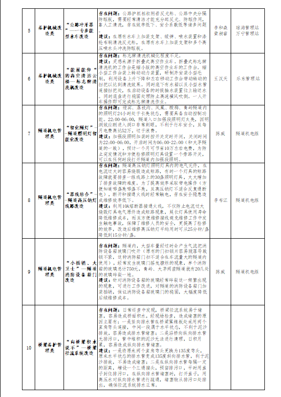 海南交控養護公司以為公路養護提建議為切入點,在全公司范圍內征集“金點子”,各管理站職工主動思考、踴躍投稿,經過一個月的收集評審匯總,從眾點子中評選出養護工藝改進類、養護機械改造類、隧道機電管理類、橋梁養護管理類、養護作業管理類、養護小妙招類,共14條“金點子”,全部列入“李和森紅色工匠工作室”專項攻關課題。金點子與公路養護工作緊密貼合,并冠以富有特色的課題名稱。例如翻漿瀝青路面修補工藝的“水泥砂漿和瀝青混凝土的最美遇見”,養護機械改造類的“事半功倍的補坑神器”,隧道機電管理類的“智化隧燈”,橋梁養護管理類的“向橋梁積水說不”......小巧思蘊涵大智慧,海南交控養護鼓勵以工作室為平臺,支持職工在各自崗位大膽嘗試“小改小革”,通過小微改造成就個人,造福企業。