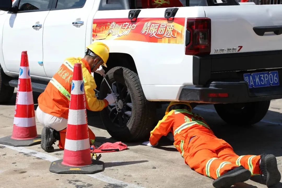 為進一步提升“車輪上黨小組”為群眾服務的能力,增強應急救助實操技能,特別設置了“車輪上黨小組‘急速換胎’技能競賽”。比賽現場,參賽選手從作業控制區布置、輪胎更換操作、作業控制區撤除至回到比賽起點一氣呵成。隊員們動作嫻熟、技能精湛,充分展現了應有的技能水平。經過激烈的比拼,定安站技勝一籌,摘得本輪項目桂冠,永興站、坡心站分列二、三名。