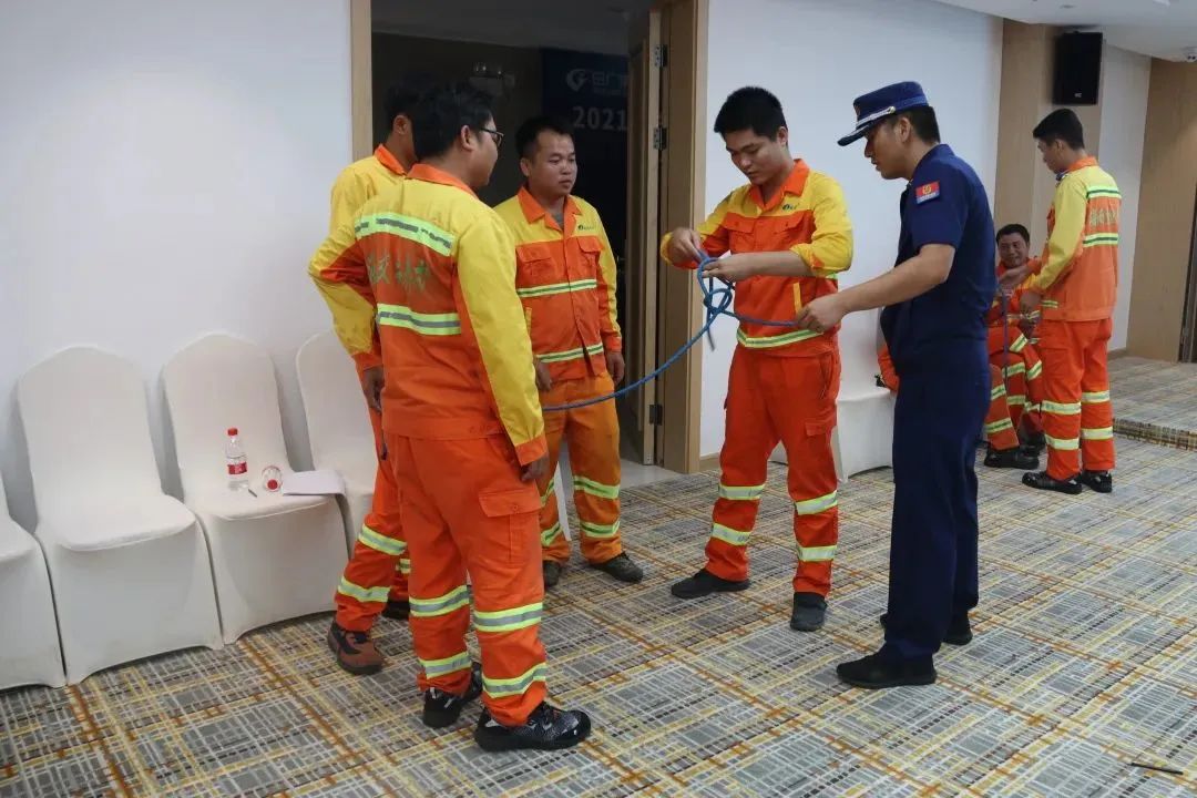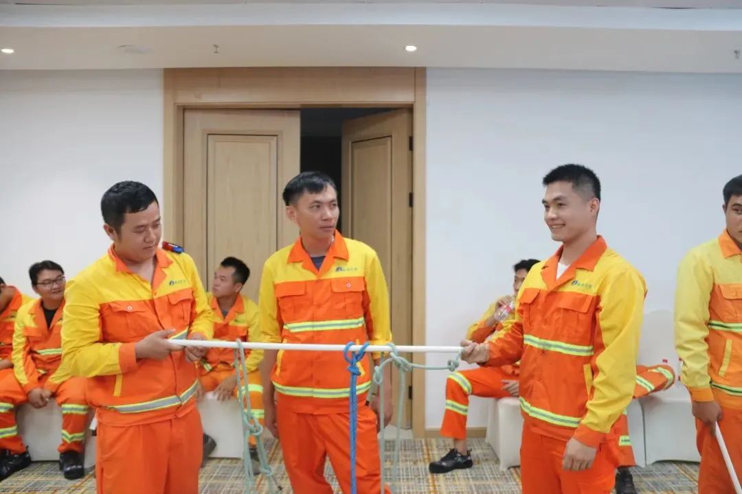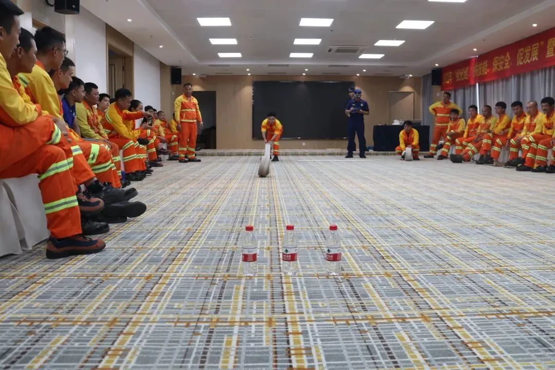 消防應急培訓環節邀請了定安消防救援大隊為參賽選手進行防災減災知識培訓。培訓過程中穿插隨機問答環節,既增強職工們防災減災意識和自救互救能力,又適時活躍現場氣氛。現場競技項目分為逃生繩結、收水帶、水帶保齡球及消防來找茬環節,參賽隊員全身心投入,踴躍參與、勇于挑戰。最終,瓊海站獲得該項目第一名,萬寧站、永興站分別取得第二名、第三名。