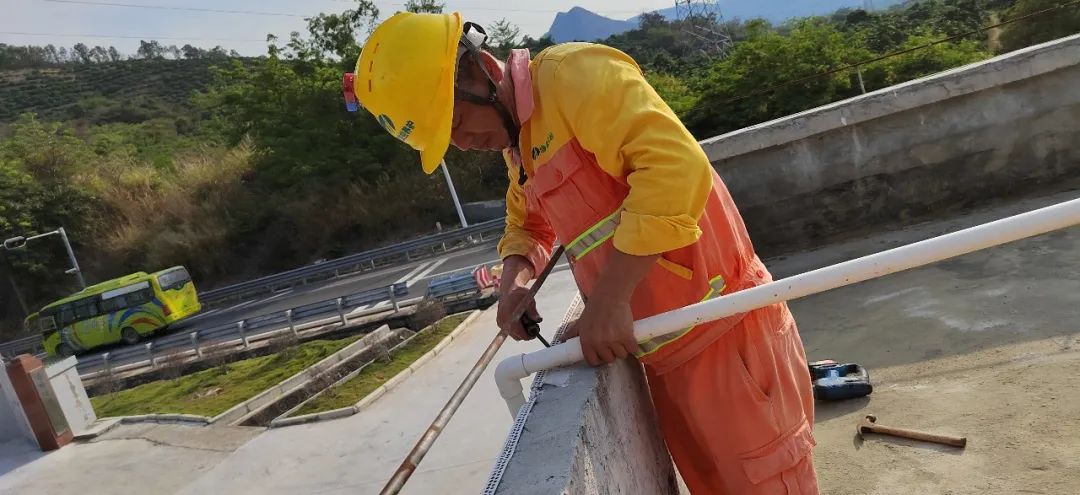 剛踏入崖城管理站的大院,就看到身著橘黃色工作服的身影蹲在地上,小心翼翼地敲打著模具。走近一看,正是人們口中的隧道“啄木鳥”李布江。