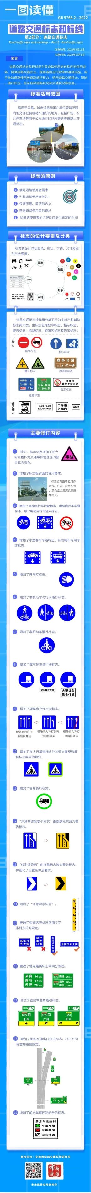 《道路交通標志和標線 第2部分:道路交通標志》(GB 5768.2—2022)即將于今年10月1日實施。該標準是市場監管總局(標準委)會同交通運輸部、公安部,組織全國交通工程設施(公路)標準化技術委員會,對2009年版道路交通標志強制性國家標準進行的修訂,已于今年3月15日批準發布。