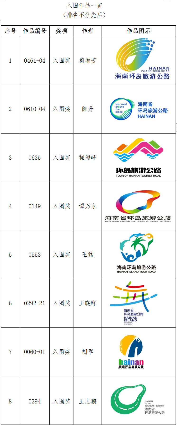 為打造傳世之作,更好地宣傳推介海南省環島旅游公路,提升最美麗公路、最現代化公路的獨特魅力和豐富內涵,海南交控面向社會各界公開征集海南環島旅游公路形象標識(Logo)設計方案。征集活動開展以來,受到社會各界的高度關注和積極參與,收到來自設計師、設計機構、高校師生等作品近千件。經評審專家初評、復評、終評嚴格篩選,綜合網絡人氣投票情況,共評選出8件入圍作品,優勝獎、優秀獎空缺,現將獲獎作品予以公示。
