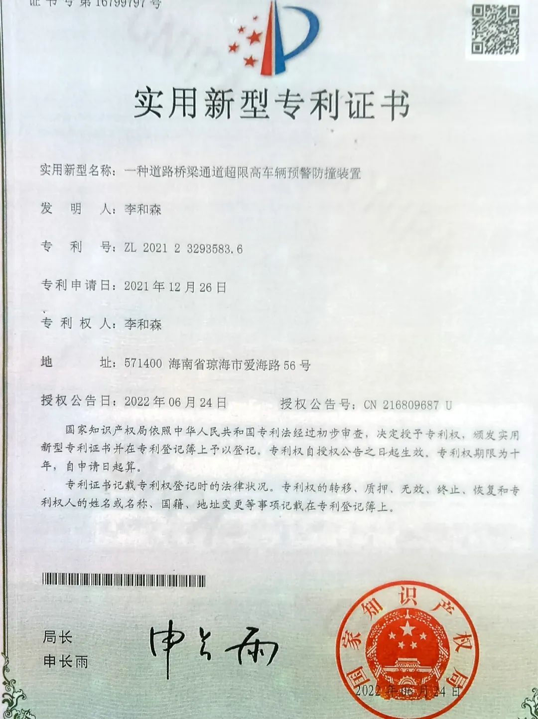看到問題后,養護公司瓊海管理站李和森站長不斷思索、主動請纓,以“紅色工匠工作室”為主要陣地,經過反復論證,多次試驗,破解了技術難點,設計了一種道路橋梁通道超限高車輛預警防撞裝置。
