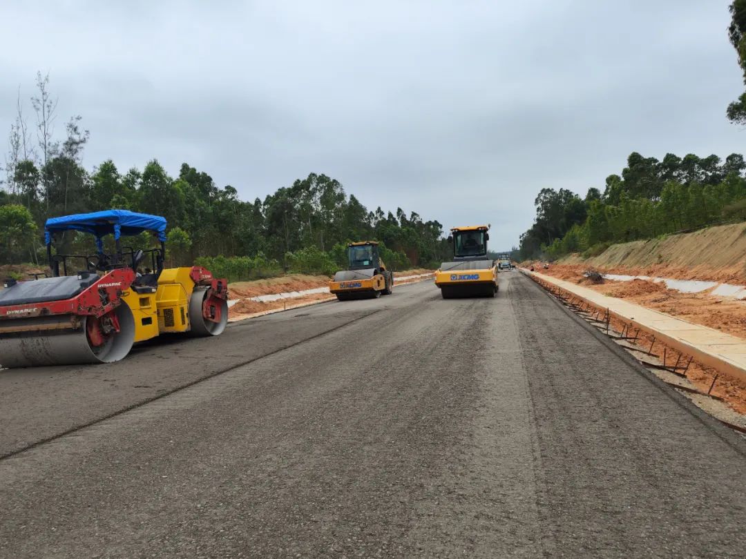 當天,環島旅游公路項目五工區施工現場也是一派熱火朝天的景象,攤鋪機轟鳴不斷、運輸車來回穿梭、工人正在加緊施工,施工作業面繁忙而有序。