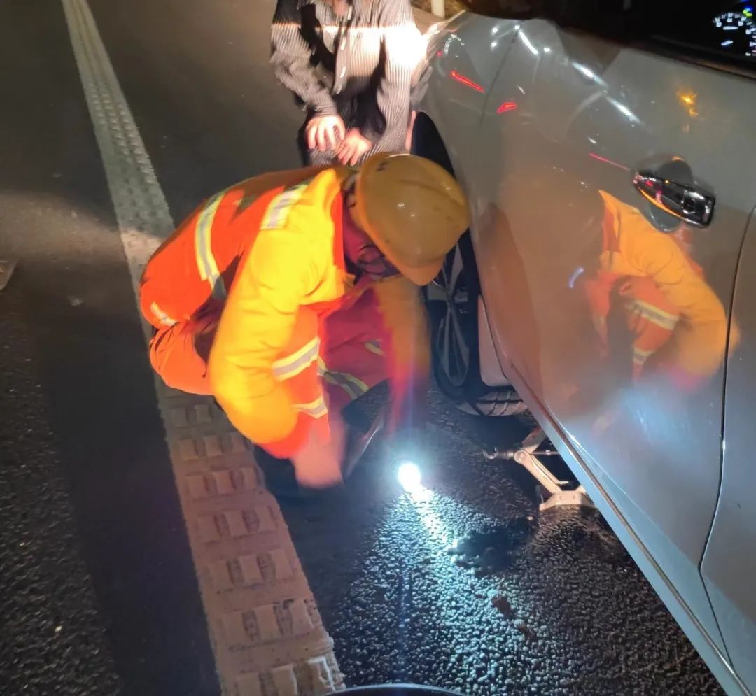 1月9日夜間,楊女士獨自一人駕車行駛在高速公路上,行駛過程中車輛突然爆胎,存在嚴重的安全隱患。楊女士在應急車道上無助地撥打電話向朋友求助,由于已是深夜,電話均未接通。獨自一人的楊女士感到十分無助,焦急萬分。此時,公司瓊海管理站的崔傳福、蘇慶福在前往清障的路上遇到了在應急車道焦急等待的楊女士,他們立馬將車輛停靠,放置安全警示標志做好安全防護措施。在了解情況后,他們二話不說立即為楊女士更換了車備胎。更換完備胎之后發現備胎氣壓不足,存在行駛隱患,兩名同志不顧寒風凜冽,又帶領楊女士前往修理廠處理故障,保證了行車安全。