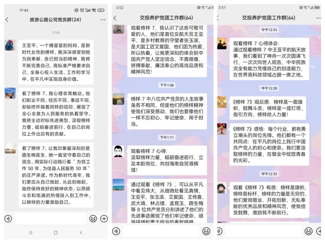 榜樣如星火,照亮新征程。為大力踐行社會主義核心價值觀,弘揚道德模范精神,培育文明新風,環島旅游公路公司黨支部、養護公司黨支部黨員通過車載播放、線上討論的形式集中觀看《榜樣7》,學習八位榜樣人物的精神內核,感悟中國共產黨人堅定信念、踐行宗旨、拼搏奉獻、廉潔奉公的高尚品質和精神風范。以專題片中的榜樣為標桿,把“榜樣力量”轉化為“實干力量”,從自身做起,以正能量影響身邊人,以飽滿的熱情投入工作,做一名有進取、有擔當、有作為的共產黨員。