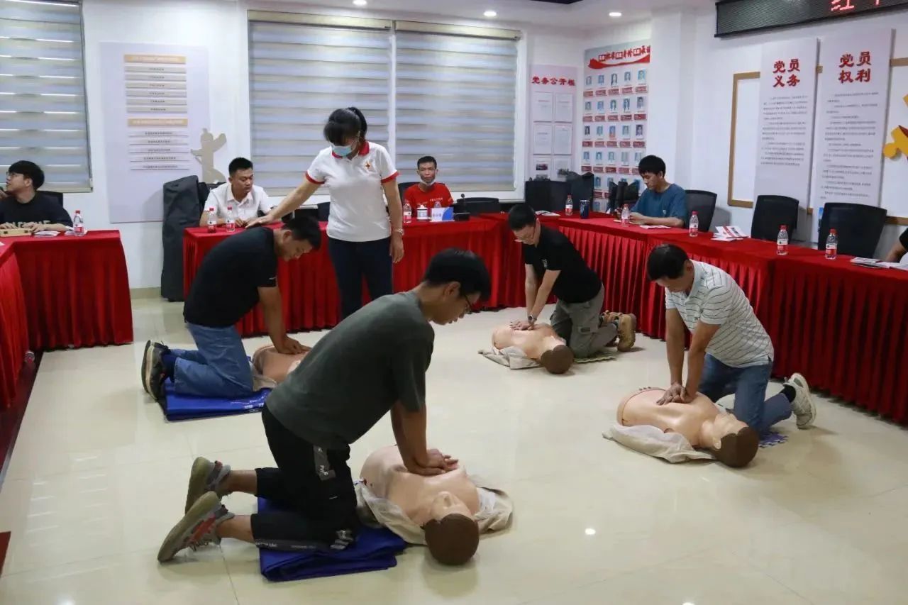 培訓的重頭戲是應急救護知識實操——心肺復蘇術和創傷包扎。心臟復蘇實操環節,參訓學員認真觀摩學習仰頭舉頦、開放氣道、高質量的胸外按壓、人工呼吸等心肺復蘇技術,培訓師們現場對參訓學員判斷是否喪失意識、有無自主呼吸、胸外心臟按壓、清理口腔異物等操作方法逐一進行指導糾正。在創傷包扎實操環節,為更好學習三角巾和繃帶的各種包扎技巧,學員們兩人一組互相練習,在反復操作中掌握了正確的急救要領。