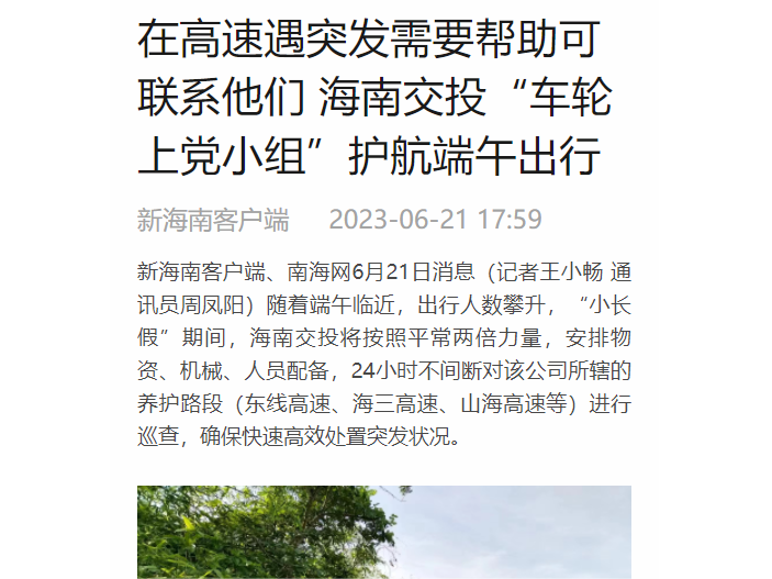 祥和假期,服務有我。為給廣大群眾帶來暖心出行服務,海南交投養護公司通過海南日報APP、新海南融媒體、海南交通廣播官微等平臺,推送服務聯系方式,制作“車輪上黨小組‘服務指南’”視頻以及發送短信等方式為廣大出行司乘進行出行溫馨提示,截至目前,圖文、視頻宣傳瀏覽量近1萬次,發送短信218萬條。“端午”期間,“車輪上黨小組”受理求助并共提供更換輪胎、護送雨天滯留乘客等助民便民服務6次。