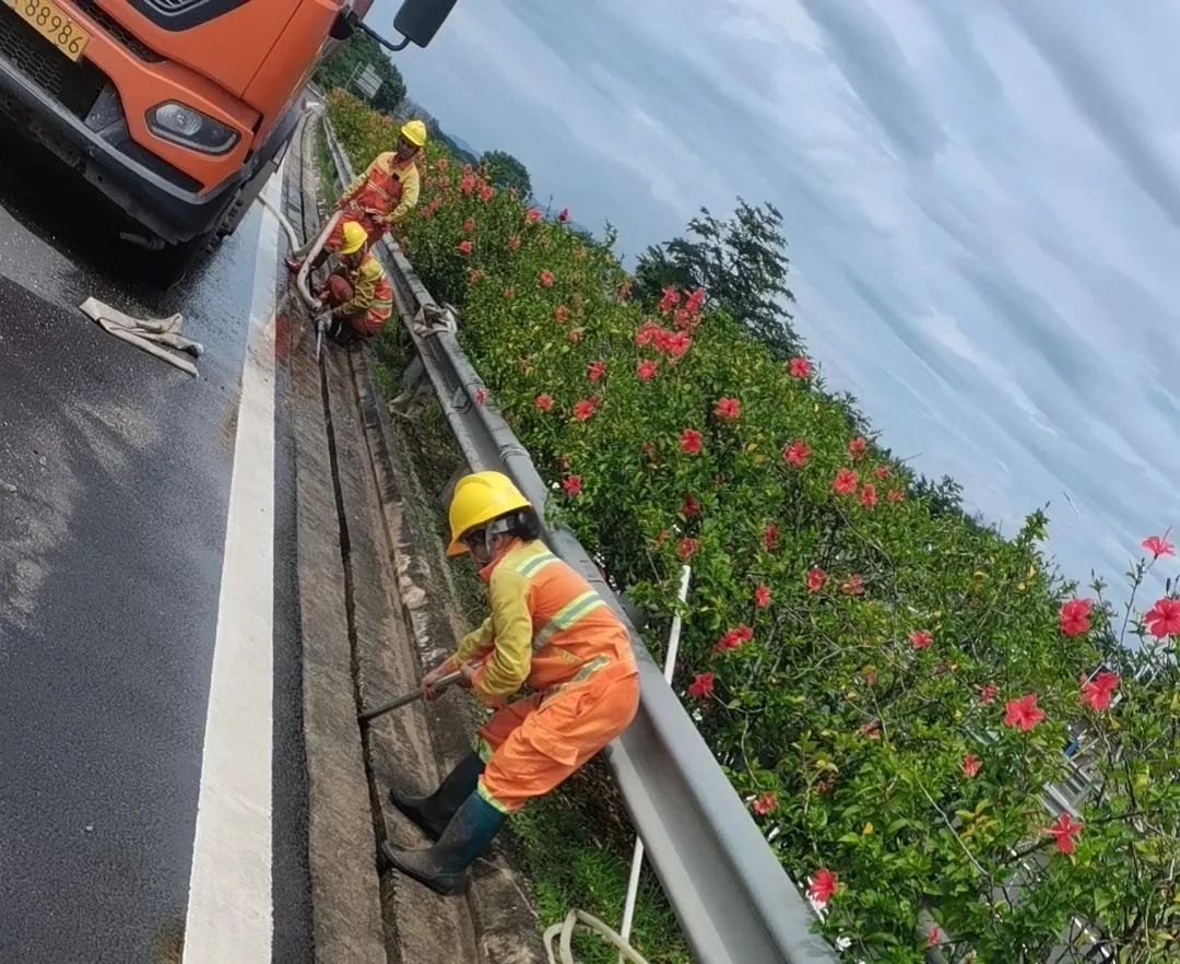 經過系列清淤舉措,水車里的水在高壓泵的作用下,強有力的從出水口噴射出去,立時便將暗溝內的淤泥雜物沖出,高效地為高速公路暢通了“腸道”,有效緩解了強降雨期間路面積水壓力。經過多次工作實踐,證實了該方案能大大提高中央分隔帶小水溝清淤效率,減少養護工作占道時間,不僅節約了養護成本,還極大提高了安全系數。