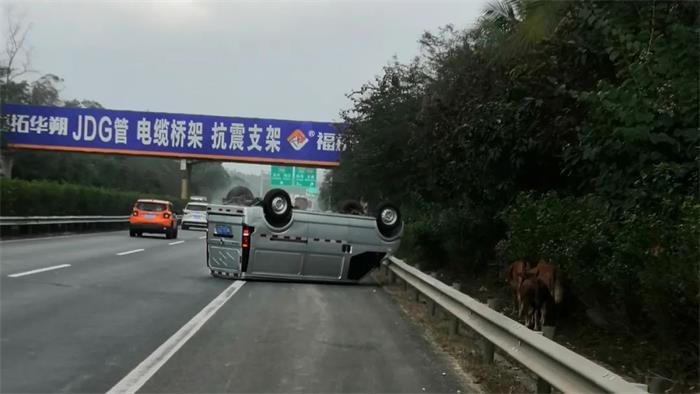 日前,海南交投養護公司定安管理站養護人員陳高文和2名工人在收工途經G98海南環島高速海口往三亞方向38公里附近,目睹了一輛小貨車連續翻滾兩圈,最后車輪朝天,仰翻橫跨在應急車道和行車道上。