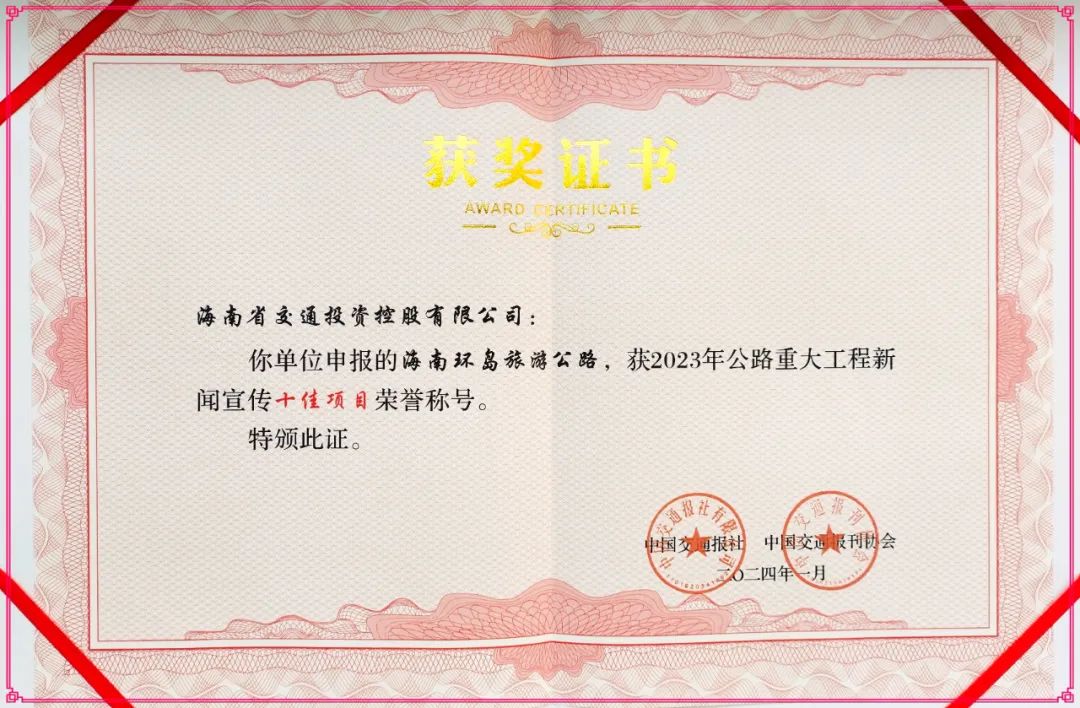 3月28日至29日,由中國交通報社、中國交通報刊協會聯合主辦的交通建設企業新聞宣傳工作座談會暨公路重大工程新聞宣傳“十佳項目”經驗交流會在福建廈門召開。由海南省交通投資控股有限公司(以下簡稱海南交投)申報的海南環島旅游公路榮獲2023年公路重大工程新聞宣傳“十佳項目”,海南交投辦公室主任吳璐伶榮獲2023年交通建設企業優秀宣傳部長,辦公室鐘芳瑞榮獲2023年交通建設企業優秀通訊員。