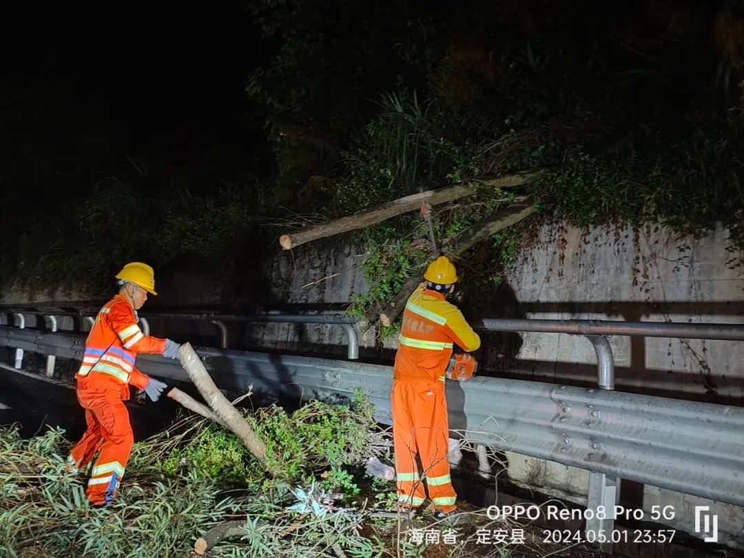 5月1日將近凌晨,養護公司定安管理站接到緊急報警電話,稱G98海南環島高速公路海口往三亞方向K51+500處的高邊坡有大樹倒伏,占據了兩個車道的險情。值班人員聞訊后迅速趕赴現場,果斷采取行動,鋸斷倒伏的樹枝,迅速清理路面,及時消除隱患,僅用時40分鐘便實現了通車。
