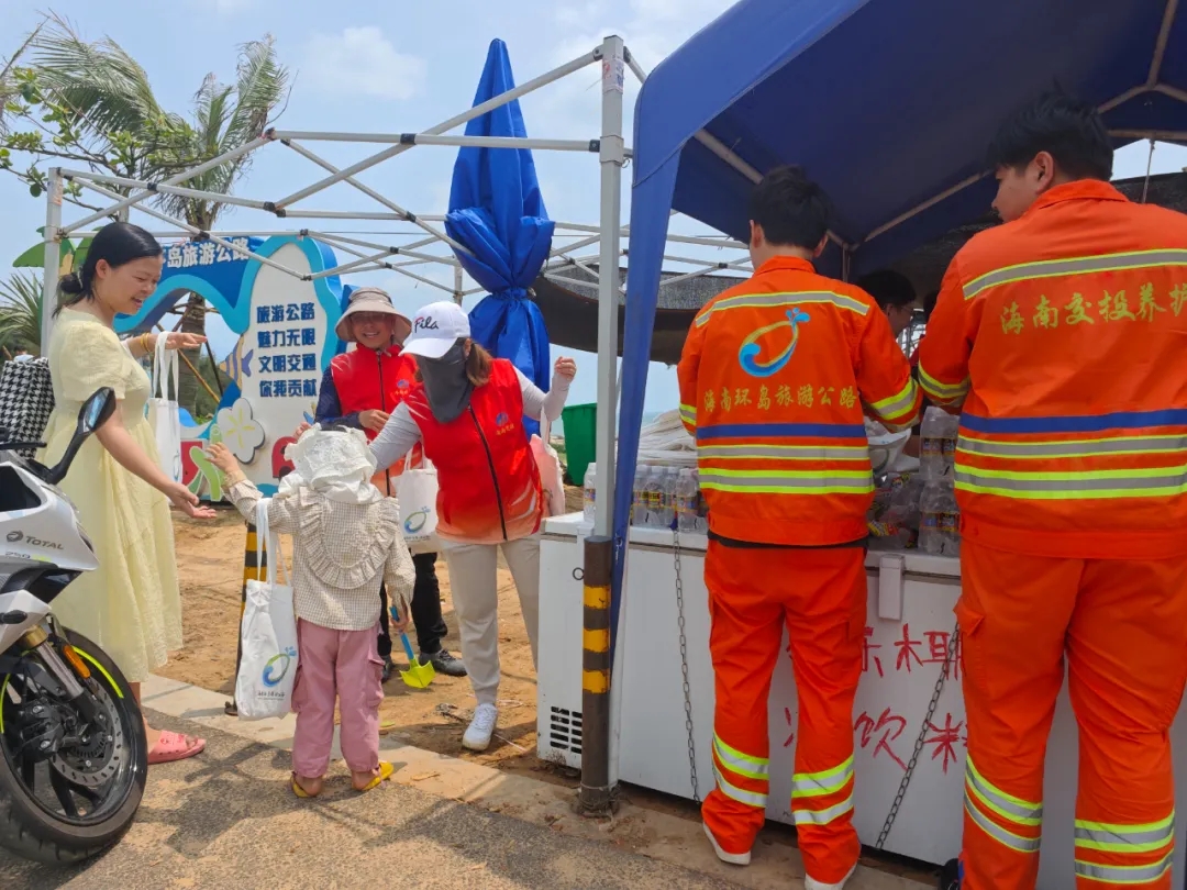 陽光炙熱,激情不減。來到海南環島旅游公路文昌木蘭灣段,身穿紅色馬甲的交投志愿者們積極履行職責,為司乘人員和過往游客提供引導服務,免費發放礦泉水、帆布袋、扇子等便民物品,深入宣傳建設環島旅游公路的重要性和愛路護路知識。