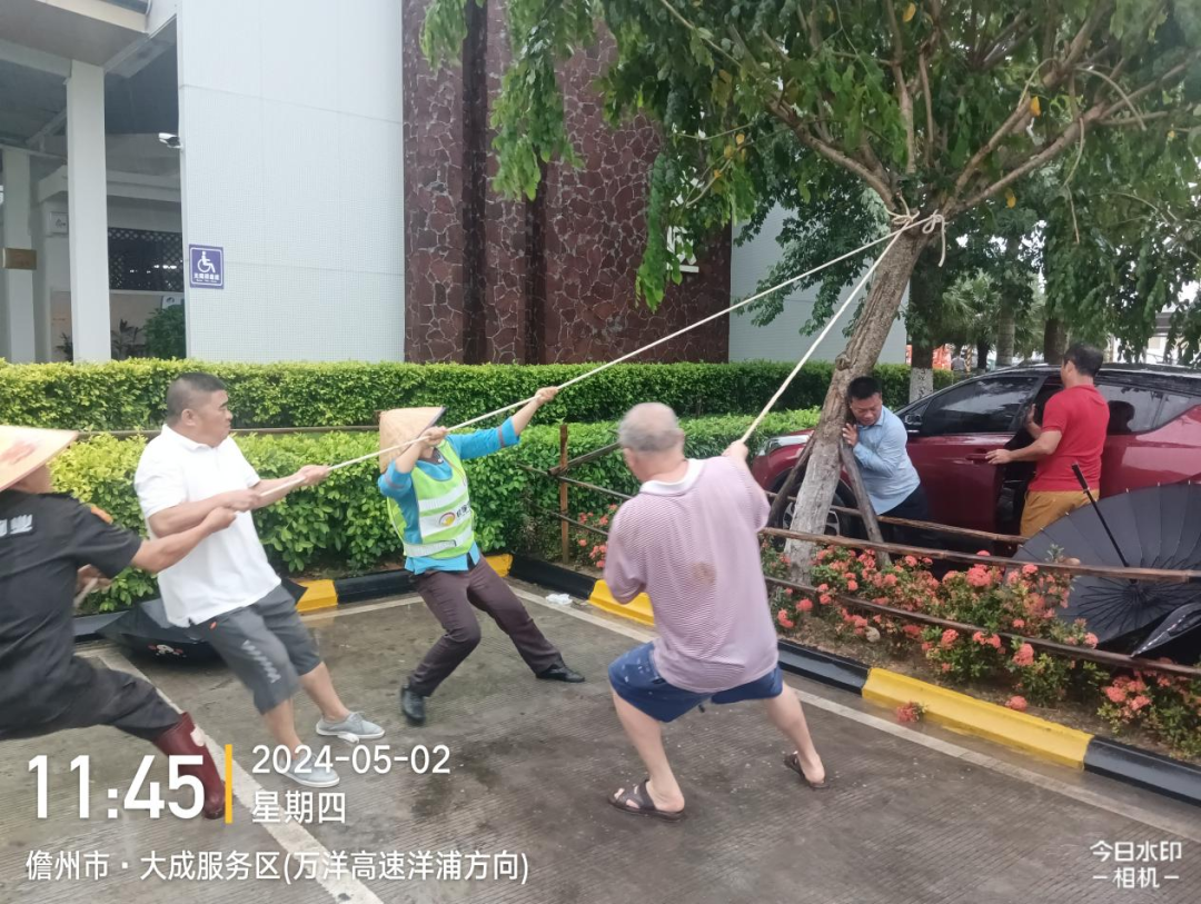 5月2日,大成服務區北區因遭遇突發暴風雨天氣,導致樹干砸到車輛。面對這突如其來的緊急狀況,服務區現場人員第一時間合力移開樹干,確保車輛安全駛離。車主也對服務區工作人員在緊急情況下的快速反應和高效處理工作表示充分肯定,對他們在極端天氣條件下所表現出的專業素養和責任心表示感謝。