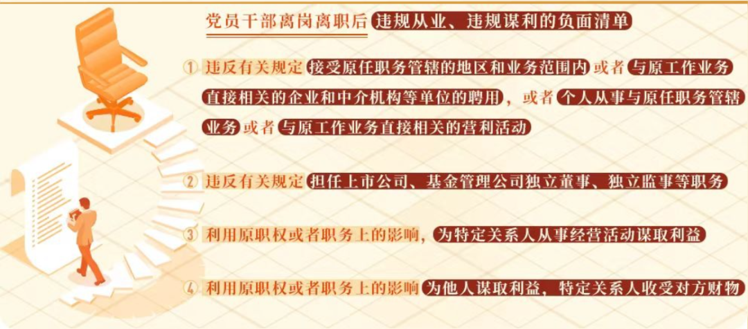 黨員干部離職或者退(離)休后,其原有的職權還會在一定范圍、一定時期內產生影響或者發揮作用。新修訂的《中國共產黨紀律處分條例》對離崗離職后違規從業、違規謀利行為列出負面清單,作出處分規定,旨在堵住政商“旋轉門”、期權式腐敗等漏洞,強調黨員干部離開崗位后,對其不能濫用職權、謀取私利等要求仍然一以貫之。