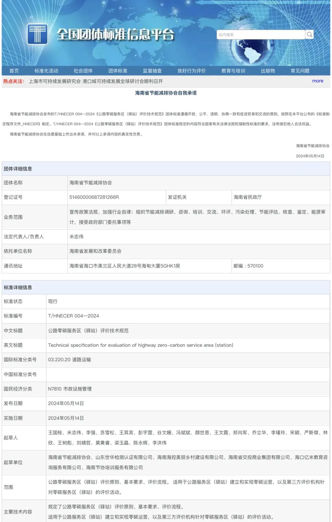 由海南省節能減排協會申報立項及編制的《公路零碳服務區(驛站)評價技術規范》,經國家標準委審核審批通過,于5月14日在全國團體標準平臺正式對外發布。交商集團作為編制單位,公司副總經理宋穎、服務區運營管理中心主任嚴斯傑作為主要起草人,參與了該規范標準的制定。這是繼馮家灣服務區榮獲“海南省零碳服務區創建示范單位”后,交商集團黨支部深化“碳路先鋒”黨建品牌建設,實踐黨建促發展的又一成果,也是公司踐行綠色發展理念,爭當海南交通領域綠色發展領頭羊的重要舉措。