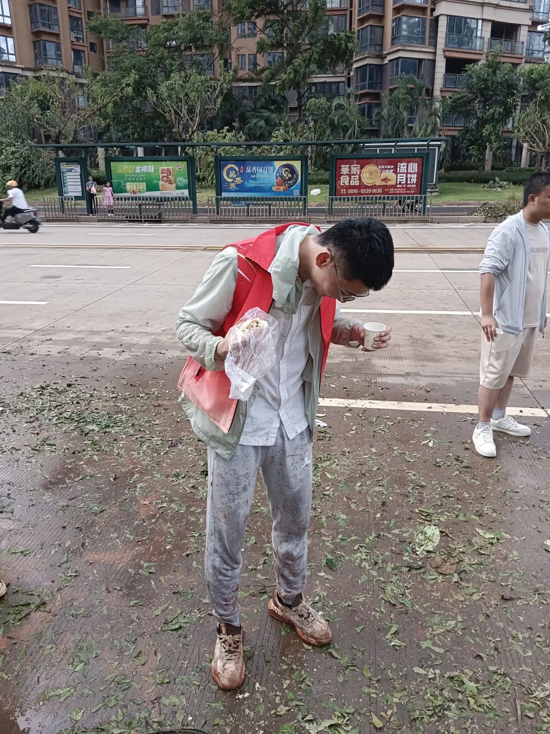 除了對項目進行清理,團隊還主動聯系當地政府,9月8日,組織成13人的路障清理小組在長濱路二街進行樹枝清理,進行了6處路障清理,長達約3公里,極大地緩解了重點路段的交通壓力。9月10日,在黨員責任區主任的組織下,他們又組成38人小隊進行了搶險保通工作,最大程度為地方貢獻出自己的力量。工作時,不少路人和沿街店鋪的店主都給團隊送來了豆漿、茶水、包子等“愛心飯”。“你們辛苦了,休息一下吧。”這一刻,心與心之間的距離因這場臺風被無限拉近。忙碌的身影后,是責任和擔當。董進成與同事們雖滿身疲憊卻眼神堅定,不停忙碌地疏通道路,清理臺風留下的痕跡。人們的生產生活雖然暫時陷入了困境,但他們內心深處的堅韌與樂觀精神,卻未曾被熄滅。當問到這幾天最難忘的事情時,董進成開玩笑說,“最難忘的事就是廢了一雙鞋,一條褲子和一件半袖。”