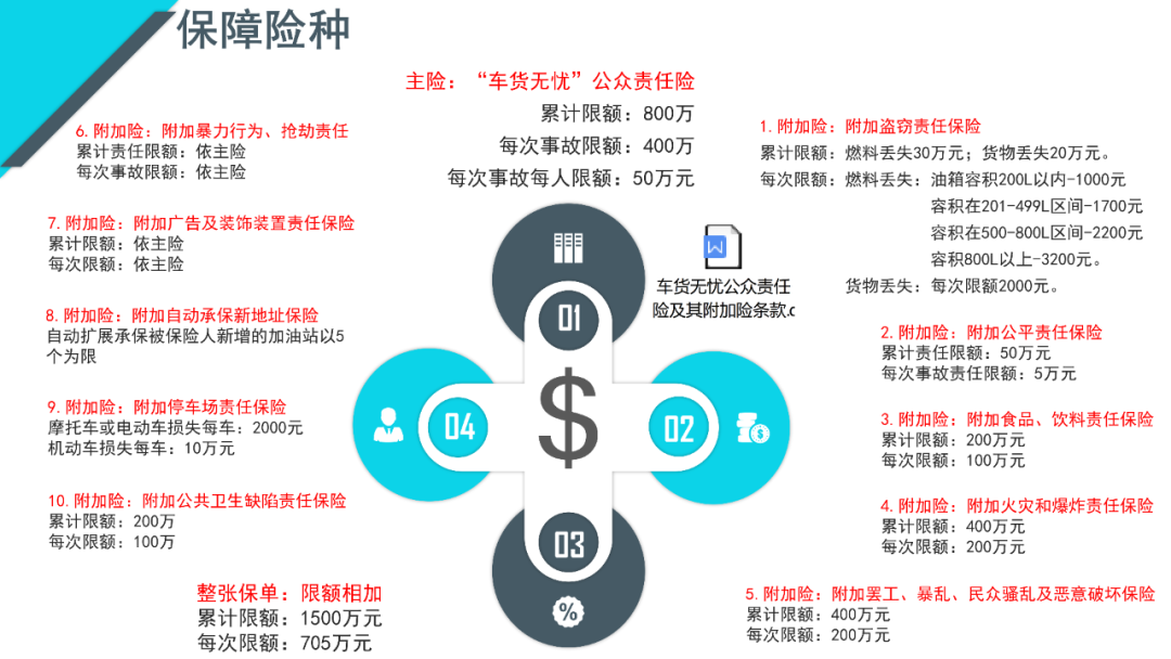 該保險涵蓋了1個主險和10個附加險。其中,針對在服務區內規范停放的貨車發生貨物、燃料丟失等事件造成的財產損失,由保險人“先行墊付”,確保司機權益不受損害。