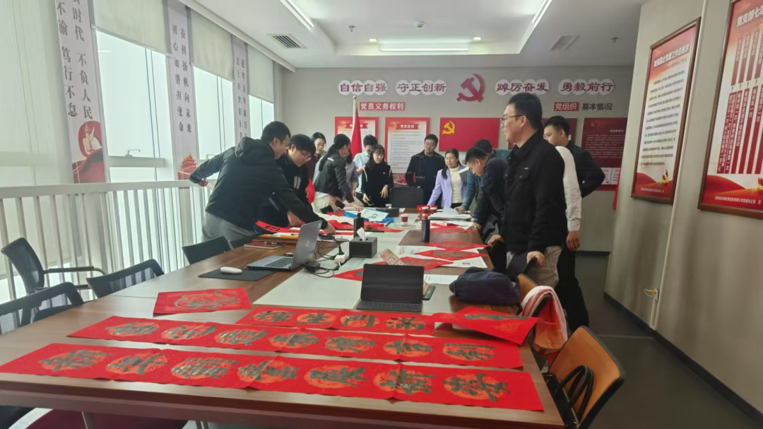 由于前來“下單”邀寫春聯的同事源源不斷,活動時間從2個小時一度延長到4個小時。承辦活動的四個黨支部黨員干部忙著登記祝福語、協助老師晾曬、整理打包分送,中午短暫休息后,又增買春聯紙張,配合書法老師書寫春聯。