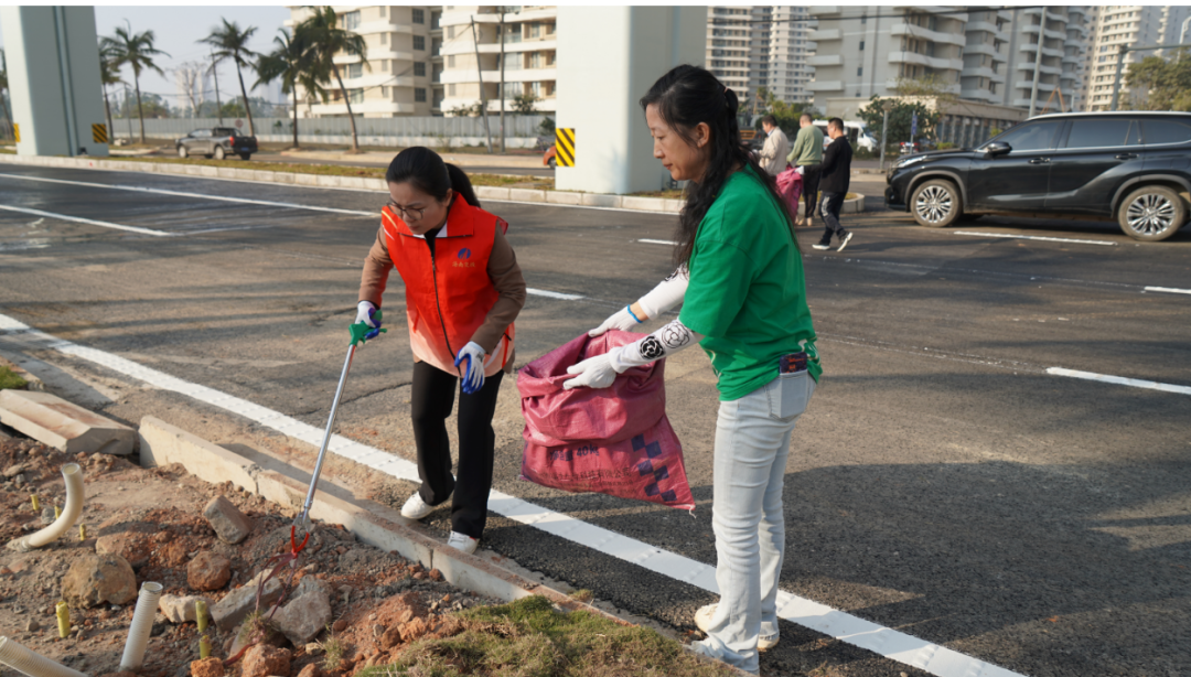 活動中,全體志愿者分成幾個小組,各自領取手套、夾子、掃把、垃圾袋等工具,明確分工、相互協作,沿著永慶大道(“二線口岸”專用通道項目連接線)開展清掃工作。黨員干部身先士卒、以身作則,帶頭清掃路面和綠化帶中的煙頭、樹枝、落葉等垃圾,不怕臟、不怕累,不放過任何一個角落。