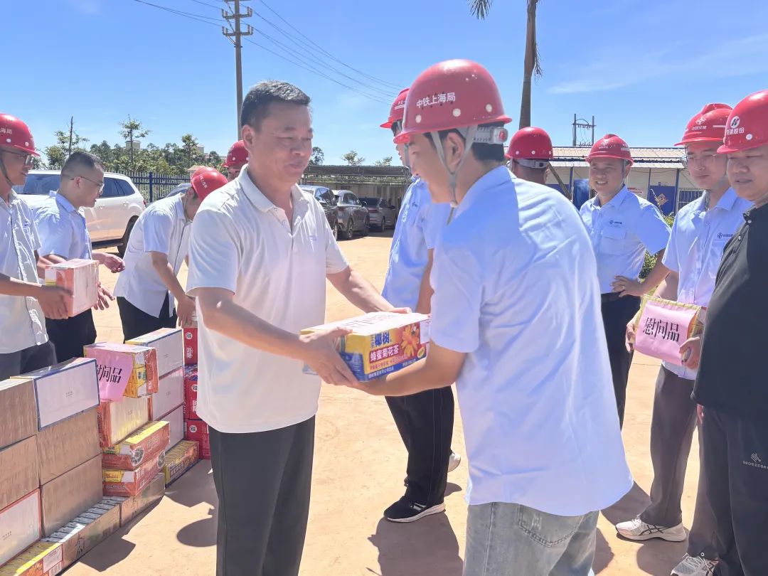 慰問組將王老吉、菊花茶、涼粉等防暑物資送到職工手中,并致以誠摯問候。伋興春對建設者頂烈日、戰酷暑的奉獻精神給予高度肯定,同時強調:“高溫天氣是安全生產的關鍵期,項目部要科學調整作業時間,落實防暑降溫措施,嚴格執行應急預案,確保職工健康與施工安全‘雙保障’。”