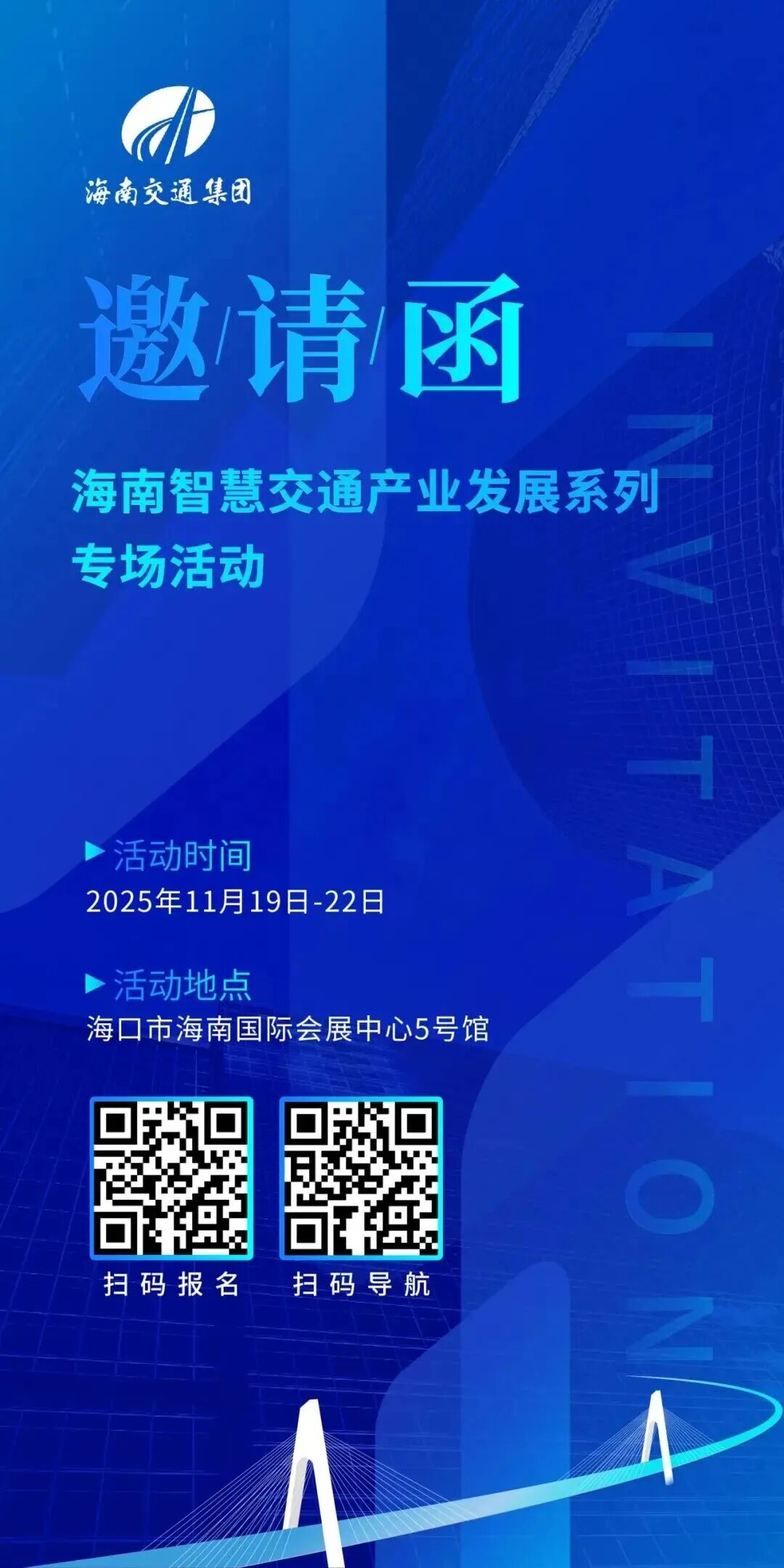 11月14日,海(hai)(hai)(hai)南日報全媒體記者(zhe)從(cong)海(hai)(hai)(hai)南省交(jiao)(jiao)通(tong)(tong)投資(zi)集(ji)團(tuan)有限公司(以下簡稱海(hai)(hai)(hai)南交(jiao)(jiao)通(tong)(tong)集(ji)團(tuan))獲悉,2025第二十(shi)屆中(zhong)國智能交(jiao)(jiao)通(tong)(tong)大會期間將(jiang)舉辦海(hai)(hai)(hai)南智慧交(jiao)(jiao)通(tong)(tong)產業發展專場活動,海(hai)(hai)(hai)南交(jiao)(jiao)通(tong)(tong)集(ji)團(tuan)已正式發出(chu)“邀(yao)(yao)請函”,報名工(gong)作正式啟動,誠邀(yao)(yao)關(guan)心(xin)支持海(hai)(hai)(hai)南智慧交(jiao)(jiao)通(tong)(tong)事業的各界有識(shi)之士(shi)參與,共(gong)繪海(hai)(hai)(hai)南數智交(jiao)(jiao)通(tong)(tong)新藍圖。