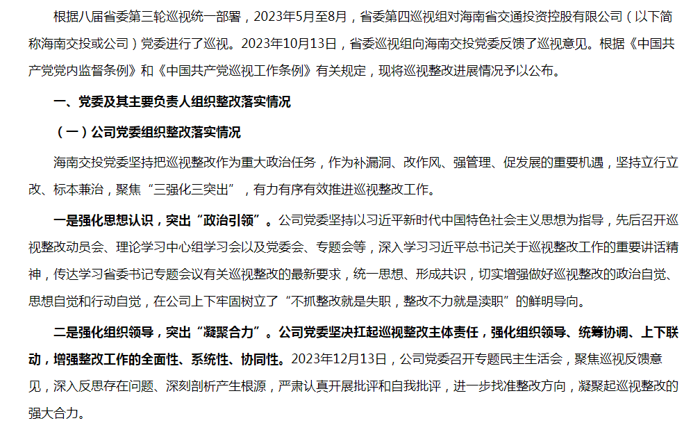 根據八屆省委第三輪巡視統一部署,2023年5月至8月,省委第四巡視組對海南省交通投資控股有限公司(以下簡稱海南交投或公司)黨委進行了巡視。2023年10月13日,省委巡視組向海南交投黨委反饋了巡視意見。根據《中國共產黨黨內監督條例》和《中國共產黨巡視工作條例》有關規定,現將巡視整改進展情況予以公布。 [更多]