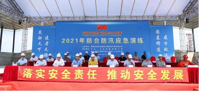 為提升海南環島旅游公路參建人員防臺防汛自救互救及逃生技能,提高項目整體防災減災能力,獻禮建黨100周年。7月2日上午,海南環島旅游公路項目2021年防臺防汛演練在項目第二工區項目部1#拌合站成功舉行。本次演練活動由中交一公局海南環島旅游公路項目第二工區項目部承辦。海南交投環島旅游公路投資開發有限公司副總經理馬吉倩及相關人員,萬寧應急管理局,項目各駐地監理單位、各中心試驗室、各工區相關負責人共計31人出席活動和觀摩演練。