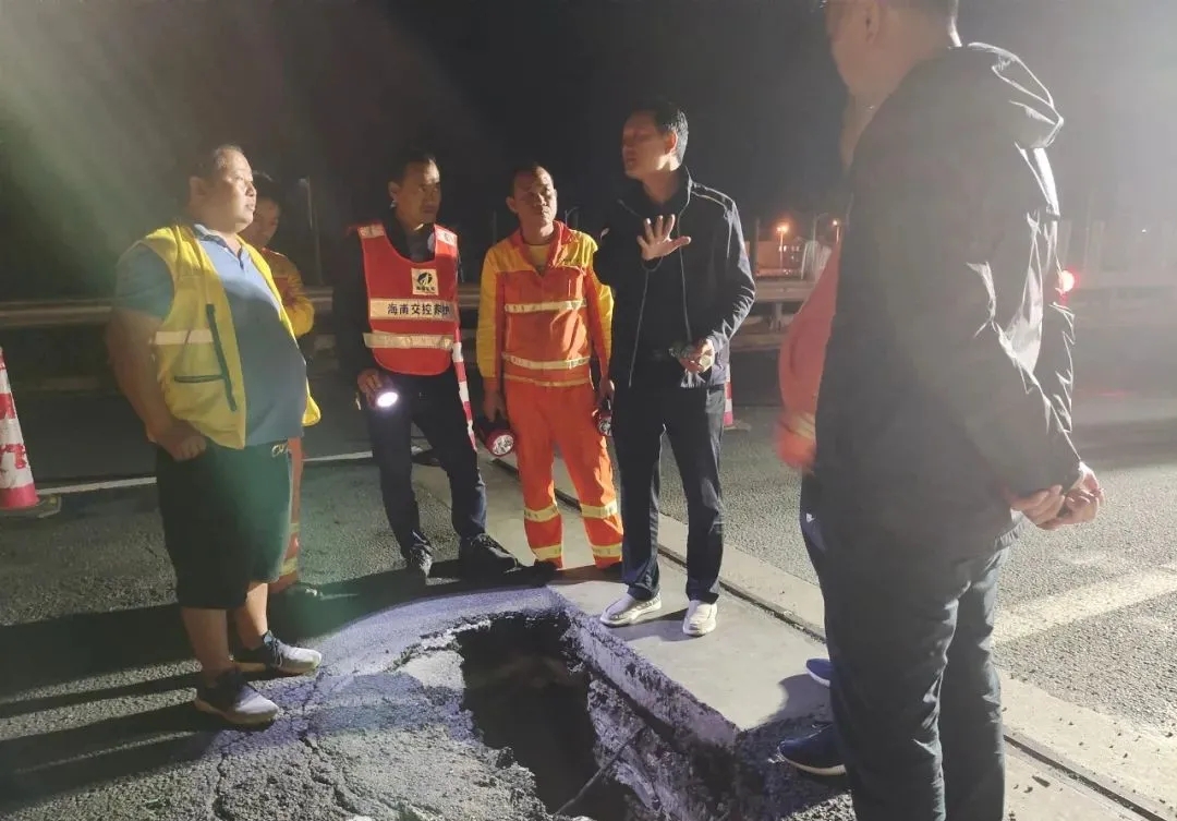 1月1日14時許, 施工人員、設備、材料均已到位,搶險正式開始。目前已完成掏空區域路面的破除,正在開展碎石的分層填注。海南交控將實施24小時不間斷施工,力爭在1月3日前完成臨時性處置方案實施,盡快開放交通,全力確保行車安全。