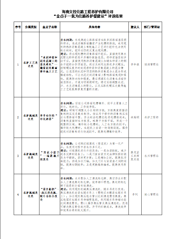 海南交控養護公司以為公路養護提建議為切入點,在全公司范圍內征集“金點子”,各管理站職工主動思考、踴躍投稿,經過一個月的收集評審匯總,從眾點子中評選出養護工藝改進類、養護機械改造類、隧道機電管理類、橋梁養護管理類、養護作業管理類、養護小妙招類,共14條“金點子”,全部列入“李和森紅色工匠工作室”專項攻關課題。金點子與公路養護工作緊密貼合,并冠以富有特色的課題名稱。例如翻漿瀝青路面修補工藝的“水泥砂漿和瀝青混凝土的最美遇見”,養護機械改造類的“事半功倍的補坑神器”,隧道機電管理類的“智化隧燈”,橋梁養護管理類的“向橋梁積水說不”......小巧思蘊涵大智慧,海南交控養護鼓勵以工作室為平臺,支持職工在各自崗位大膽嘗試“小改小革”,通過小微改造成就個人,造福企業。