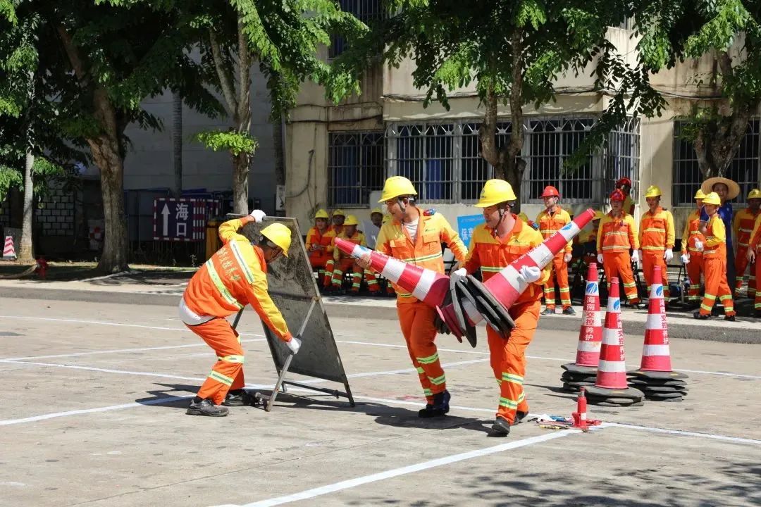在應急搶險作業控制區布置競賽環節,各參賽隊伍根據比賽現場提供的封閉單幅道路交通安全設施開展比賽,協同夜間突發應急事件作業控制區布置。此項目進一步強化了一線職工公路養護規范化作業水平,提高業務技能和安全自我防范意識。烈日炎炎,比賽隊員依舊保持飽滿的精神狀態,扛起標志牌與時間賽跑,現場布設整齊、次序井然。最終經過兩個小時的激烈角逐,永興站、萬寧站、瓊海站分別獲得該項競賽的一、二、三名。