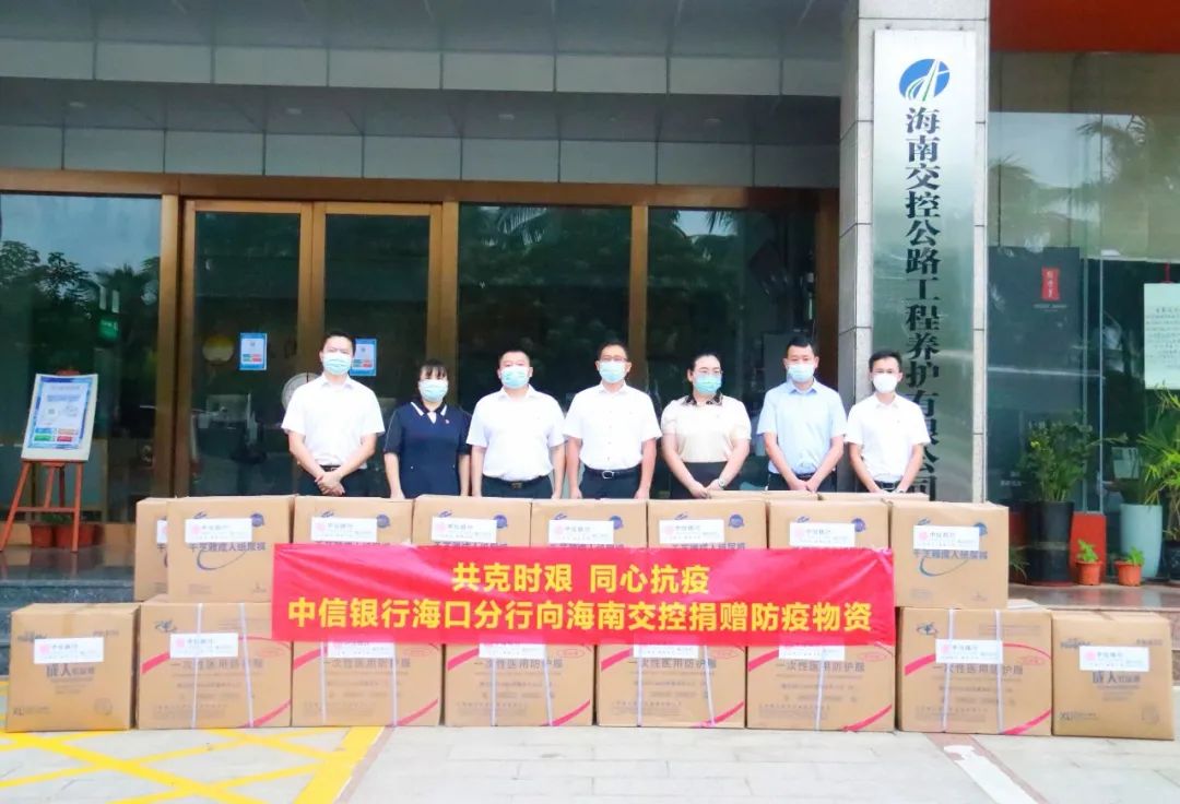 中信銀行海口分行向海南交控捐贈了醫用防護服、N95口罩、醫用橡膠檢查手套、醫用隔離面罩、成人紙尿褲各300份。當日下午,海南交控將這些物資緊急運往三亞抗疫前線,旨在幫助一線的工作人員解決實際困難,豐富物資儲備,讓奮戰在一線的工作人員更加有信心、有決心,全力打贏疫情防控阻擊戰。