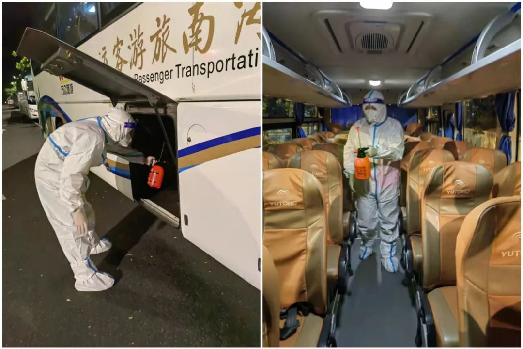 志愿者的細心和耐心是用責任心來書寫的。旅客下車后,符愷馬上進行全車消毒,不給病毒傳播留下時間,保障下一批旅客的乘車安全。在近40度的高溫炙烤下,沒過一會兒,汗水就浸濕了衣服,每天還要穿著密閉的防護服連續工作8到9個小時,說不累是假的。累了就坐路邊休息一下,剛開始難免不適應,口罩把符愷的耳朵勒得發紅起泡,他說“等結痂長繭就不疼了”。