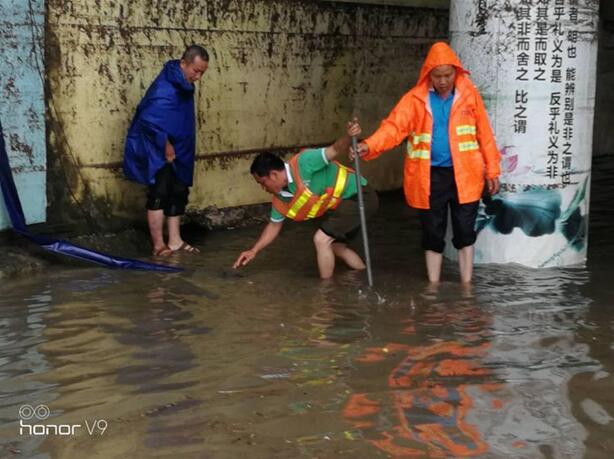 與此同時,定安管理站也在經受風雨考驗。傍晚,k18處(新坡互通立交)因地勢低洼,橋底管涵排水能力不足,加之管涵出水口排入河道水位與之持平,造成互通下出現嚴重積水,交通臨時阻斷,積水最深處達到約1.5米左右。定安站迅速組織養護人員,第一時間趕赴現場,設置安全標志牌,配合交警部門疏導交通,并留夜駐守觀察積水情況。6月7日上午,公司副總經理王槐鋒帶領職工在橋底抽水、清理垃圾,才使積水漸漸消退。直到中午,互通下交通完全恢復暢通。
