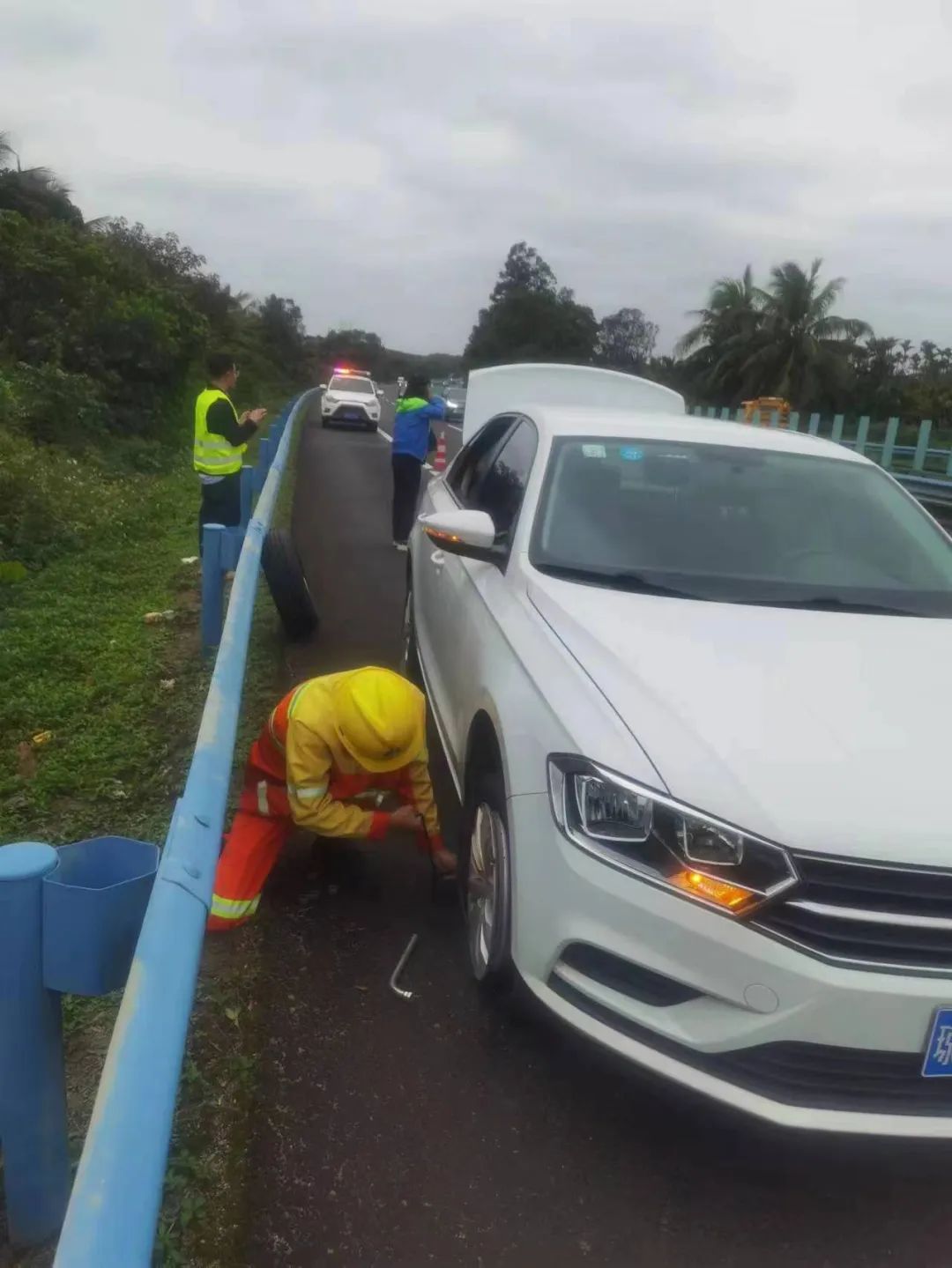 萬寧站“車輪上黨小組”成員黃昶睿、王顯金幫助車主更換備胎