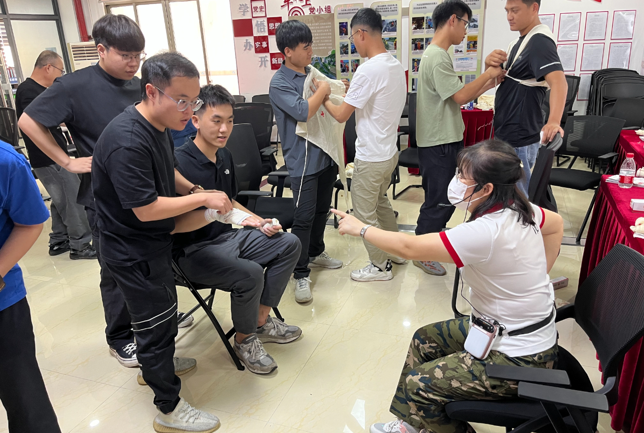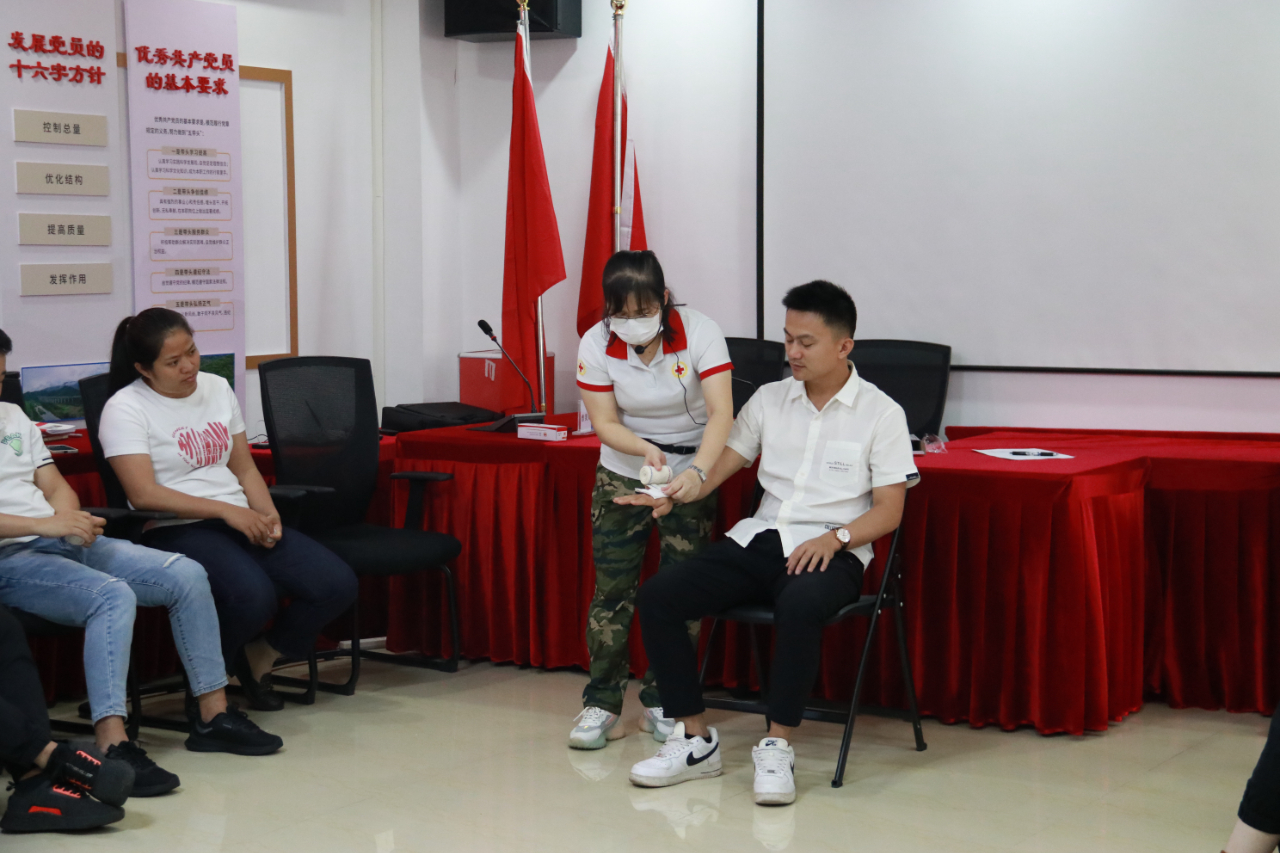 培訓的重頭戲是應急救護知識實操——心肺復蘇術和創傷包扎。心臟復蘇實操環節,參訓學員認真觀摩學習仰頭舉頦、開放氣道、高質量的胸外按壓、人工呼吸等心肺復蘇技術,培訓師們現場對參訓學員判斷是否喪失意識、有無自主呼吸、胸外心臟按壓、清理口腔異物等操作方法逐一進行指導糾正。在創傷包扎實操環節,為更好學習三角巾和繃帶的各種包扎技巧,學員們兩人一組互相練習,在反復操作中掌握了正確的急救要領。