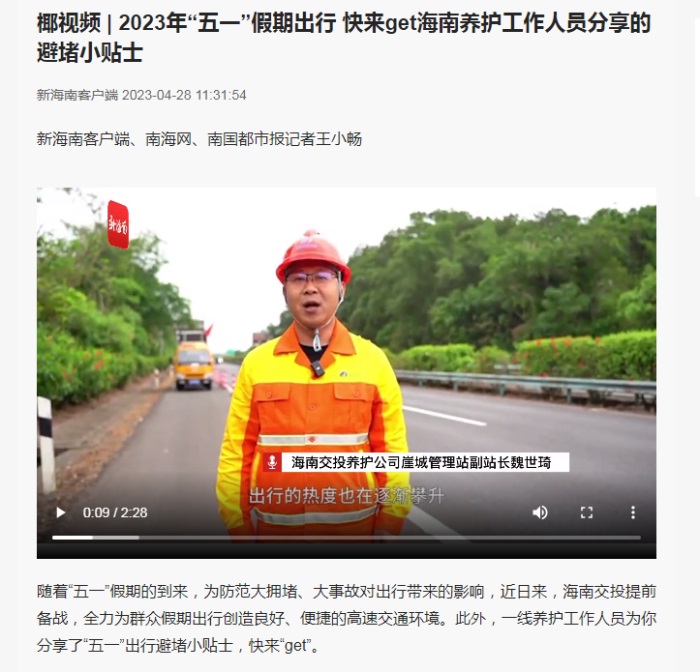 二是臨近假期,制作“請查收,您的假期出行小貼士”微視頻,在海南日報、海口網、“海南省交通運輸廳”“海南省交投”等官媒、官微上投放宣傳,同時以交通廣播、手機短信等方式,溫馨提醒節日前后高峰期擁堵路況和繞行建議。截至目前,視頻瀏覽量已累計突破1.2萬次,短信累計投放130萬條。