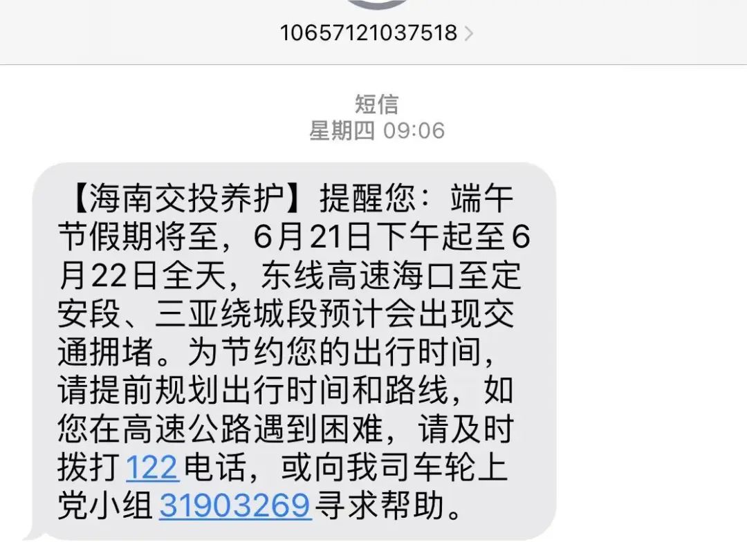 祥和假期,服務有我。為給廣大群眾帶來暖心出行服務,海南交投養護公司通過海南日報APP、新海南融媒體、海南交通廣播官微等平臺,推送服務聯系方式,制作“車輪上黨小組‘服務指南’”視頻以及發送短信等方式為廣大出行司乘進行出行溫馨提示,截至目前,圖文、視頻宣傳瀏覽量近1萬次,發送短信218萬條。“端午”期間,“車輪上黨小組”受理求助并共提供更換輪胎、護送雨天滯留乘客等助民便民服務6次。