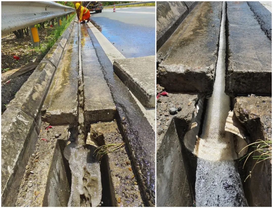 經過系列清淤舉措,水車里的水在高壓泵的作用下,強有力的從出水口噴射出去,立時便將暗溝內的淤泥雜物沖出,高效地為高速公路暢通了“腸道”,有效緩解了強降雨期間路面積水壓力。經過多次工作實踐,證實了該方案能大大提高中央分隔帶小水溝清淤效率,減少養護工作占道時間,不僅節約了養護成本,還極大提高了安全系數。