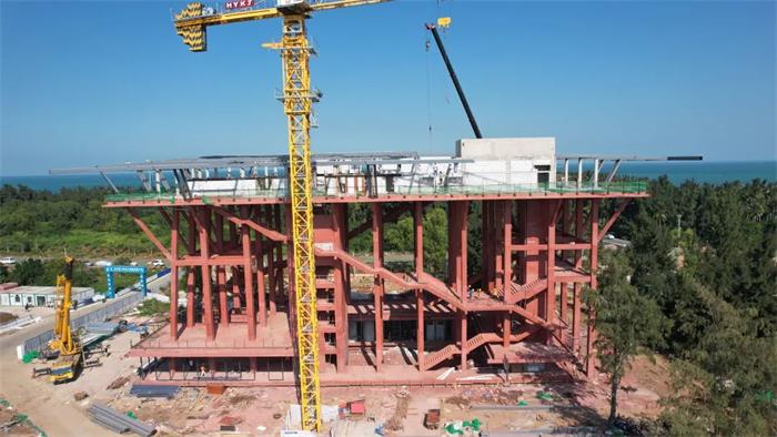 11月30日,海南環島旅游公路火山海岸驛站一期項目進入收尾沖刺階段,施工人員正在進行鋼架結構屋面面板安裝和室外工程施工作業,現場一片繁忙景象。