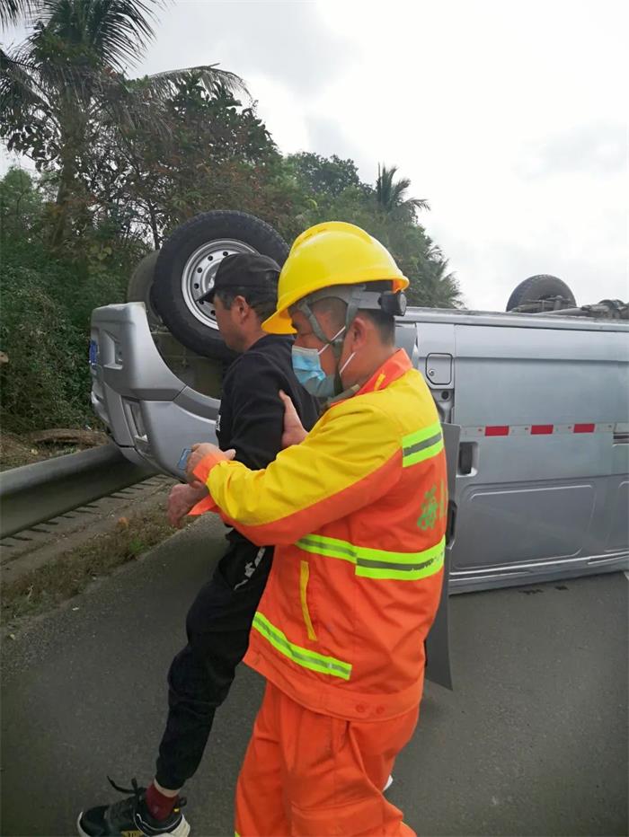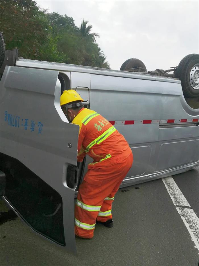 日前,海南交投養護公司定安管理站養護人員陳高文和2名工人在收工途經G98海南環島高速海口往三亞方向38公里附近,目睹了一輛小貨車連續翻滾兩圈,最后車輪朝天,仰翻橫跨在應急車道和行車道上。
