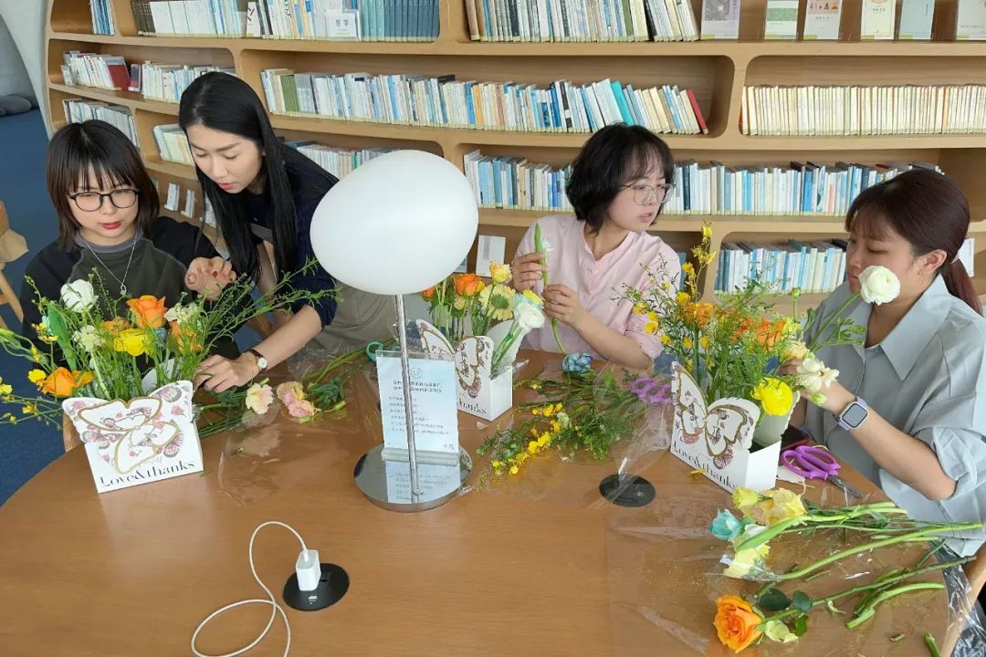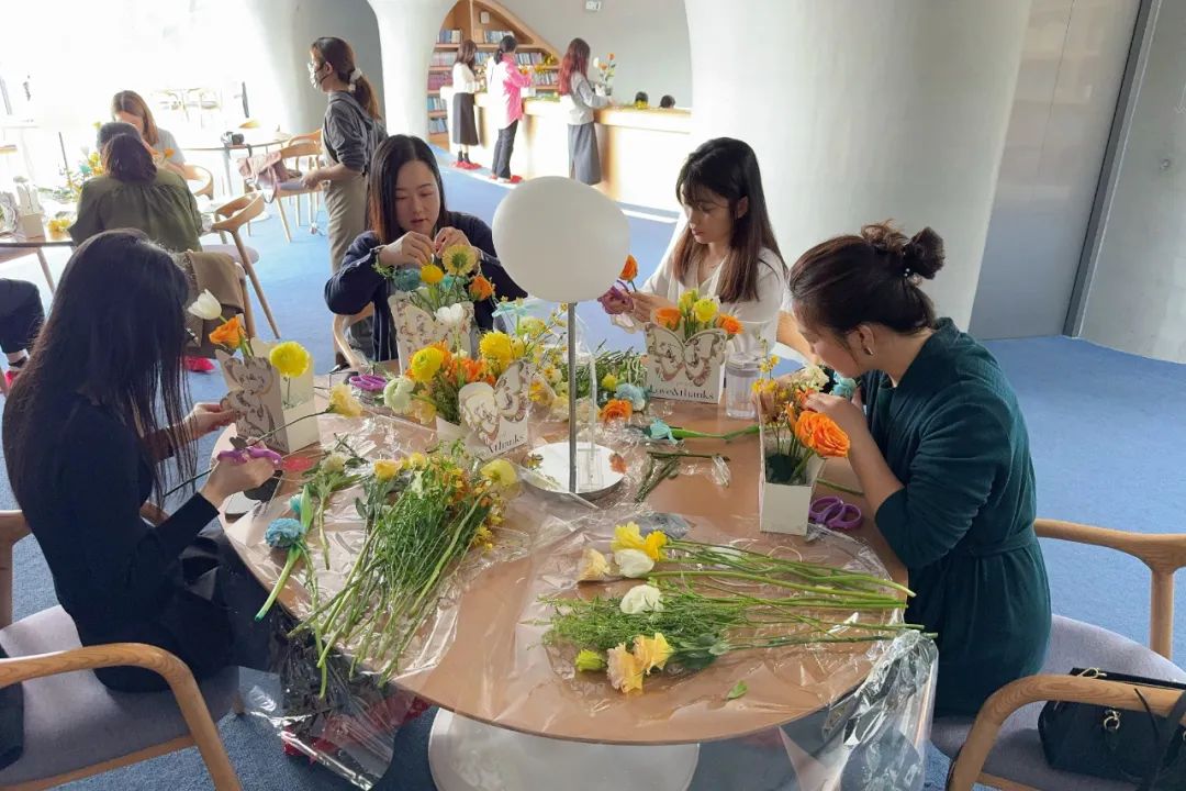 隨后,大家在花藝老師的指導下,大膽發揮自己的想象,循著花香、聆聽絮語、掌握技巧,用靈巧的雙手將玫瑰、郁金香、洋牡丹等多種花材有層次的搭配在一起,形成了一幅幅色彩繽紛、獨具匠心的藝術作品。