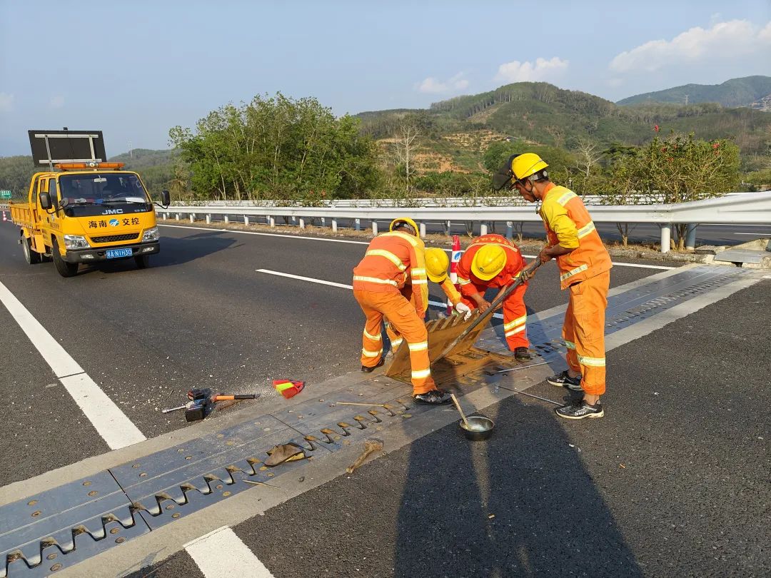 除此以外,樂東管理站還主動開展橋梁伸縮縫修復。3月6日,巡查人員在駕車經過海三高速K180+318處的好別中橋時,判斷伸縮縫梳齒鋼板的異響較為明顯,便立即停車開展檢查,發現部分螺絲已經脫出。樂東管理站索性組織人員,將鋼板上所剩螺帽全部取出,對伸縮縫進行一次徹底的“大清掃”,而后再重新安裝擰緊,焊接封膠,使該橋梁結構恢復安全穩定。