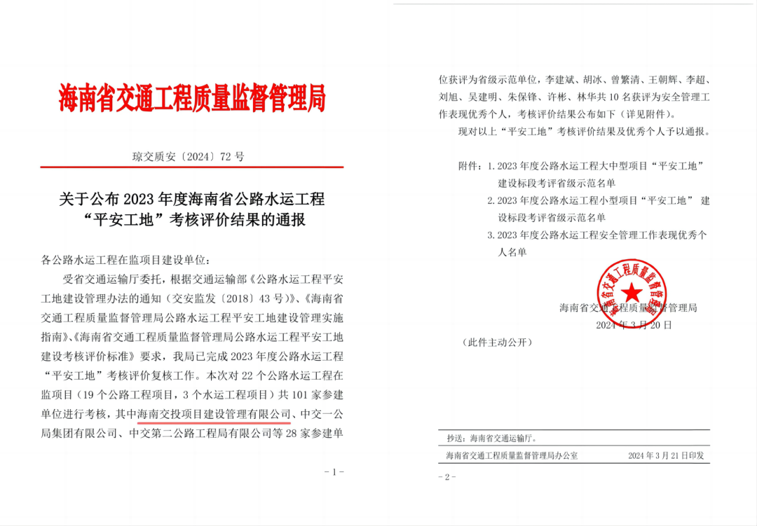 海南交投多個項目在此次省質監局2023年度海南省公路水運工程“平安工地”考核評價中得到了認可,極大地鼓舞了公司在建項目參建人員的士氣。接下來,公司將繼續高標準推進平安工地建設各項管理工作,充分發揚“示范工地”的行業標桿和示范引領作用,努力提升安全生產管理水平,確保公司建設工程安全形勢持續穩定。.jpg)