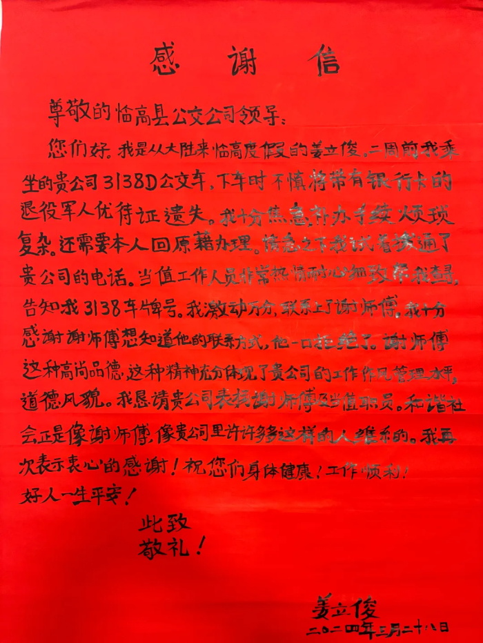 “我懇請貴公司表揚謝師傅及當值職員,和諧社會正是像謝師傅、像貴公司里許許多多這樣的人維系的……”近日,一封來自乘客姜先生的感謝信,字里行間充滿了對臨高公交的肯定和感激。