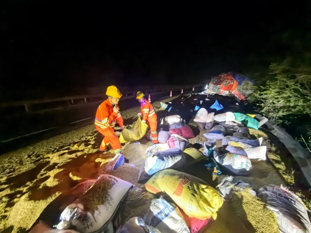 凌晨1點50分左右,G9811海三高速三亞往海口方向K38+560處發生一起追尾事件,兩輛車都不同程度損壞,且火車上撒落的稻谷造成路面污染約23米,導致行車道、應急車道無法通行,過往車輛僅能通過超車道緩慢通行。養護公司永興管理站值班人員第一時間抵達現場后,立即配合交警進行交通疏導,協助做好現場應急救援工作,同時對路面進行清理,以最高效率恢復交通。在經過近5個小時的不懈努力后,事故現場被徹底清理完畢。