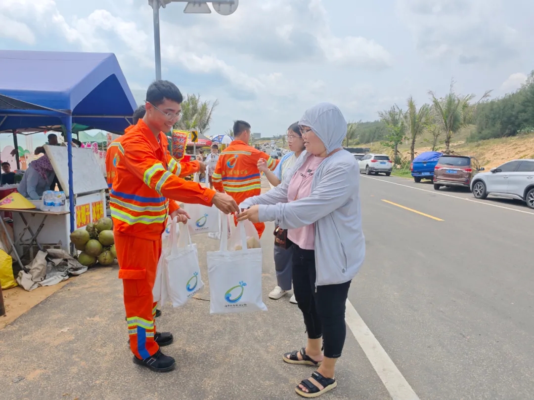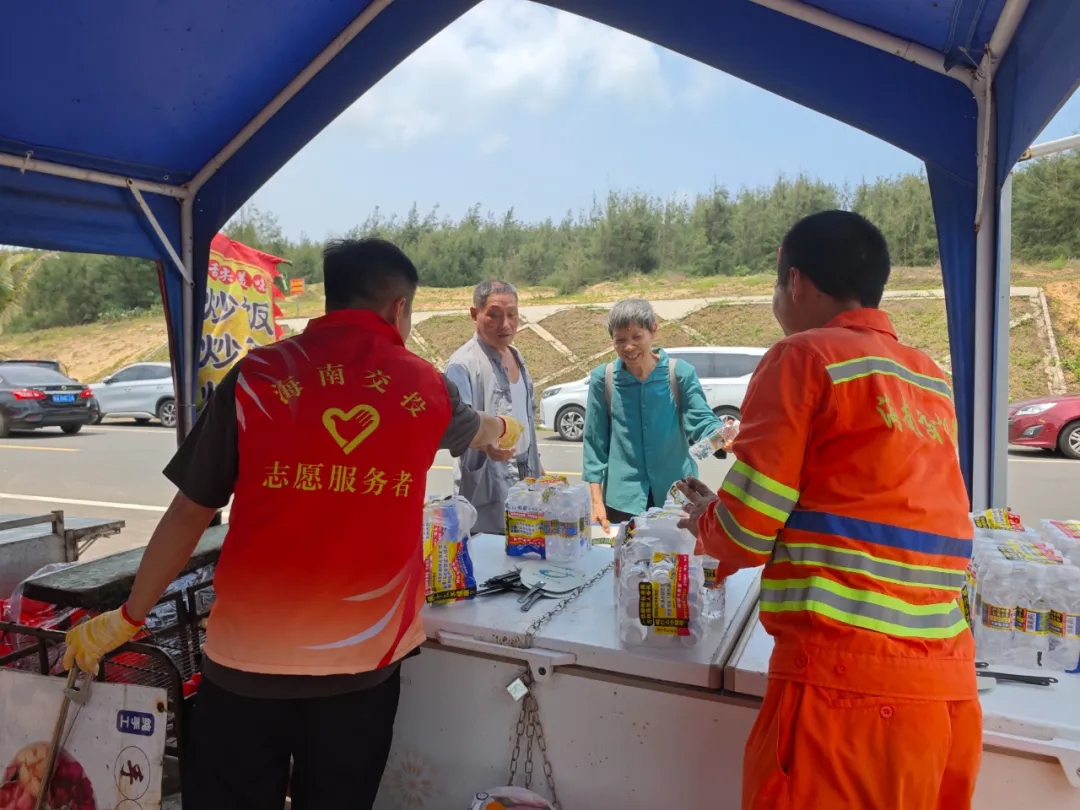 陽光炙熱,激情不減。來到海南環島旅游公路文昌木蘭灣段,身穿紅色馬甲的交投志愿者們積極履行職責,為司乘人員和過往游客提供引導服務,免費發放礦泉水、帆布袋、扇子等便民物品,深入宣傳建設環島旅游公路的重要性和愛路護路知識。